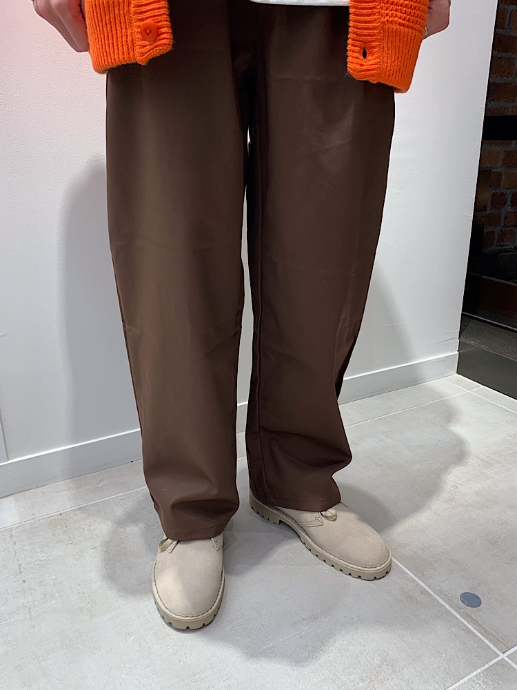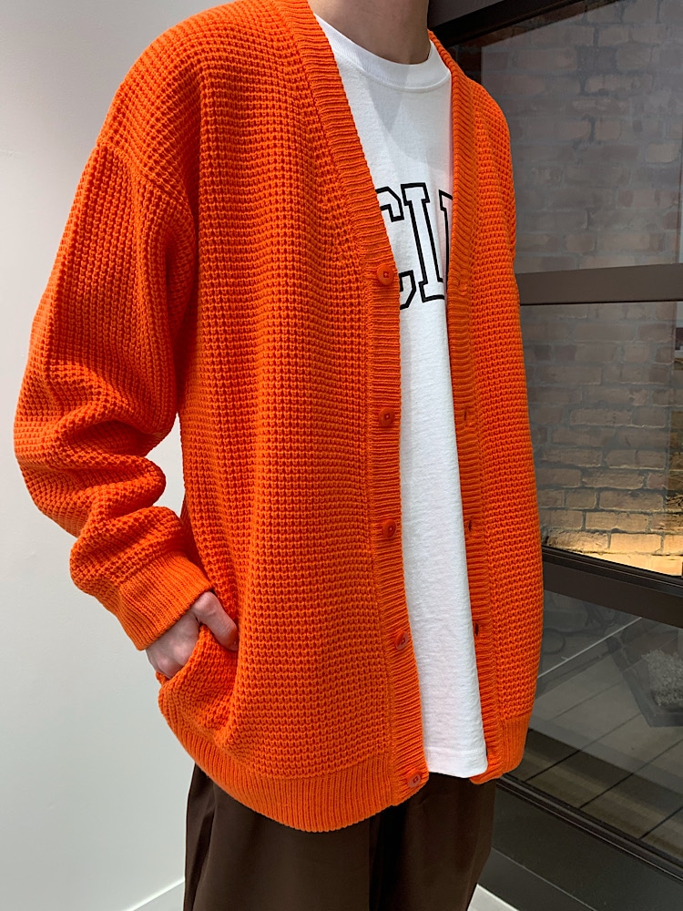 オレンジカラーのカーディガンを主役に組んだ今から出来る秋コーディネート。