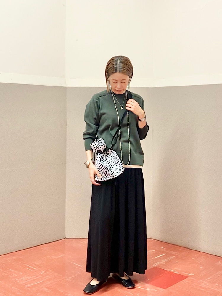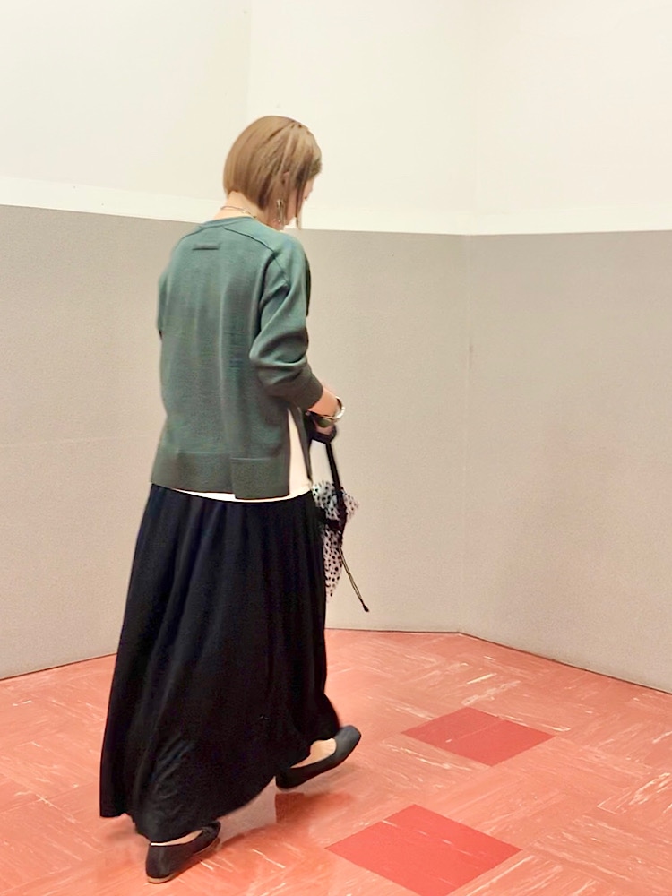 素材感・着心地:毛足の短いウールで軽く柔らかい。薄手なので広がりすぎず、動くと揺れるエレガントなとろみがある。
