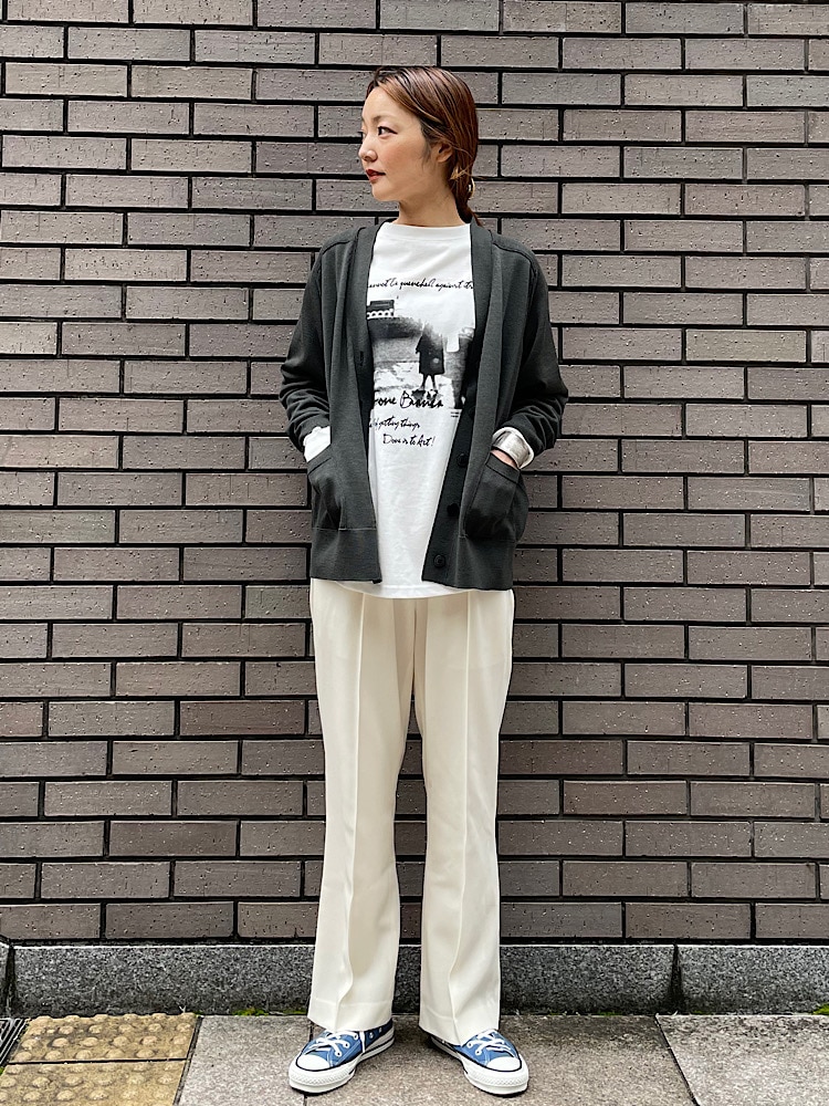 素材感・着心地:コットンの柔らかい素材感。薄すぎず一枚でも着用しやすいです。裾がラウンドになっておりレイヤードスタイルにもピッタリです