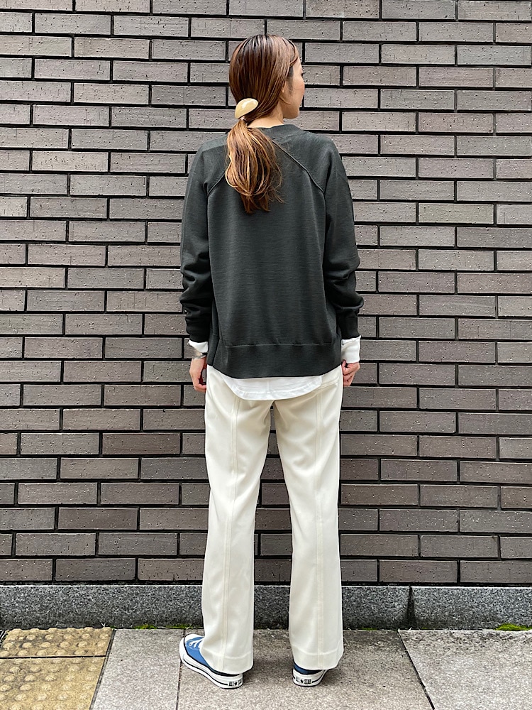 素材感・着心地:ウール素材で、柔らかく厚みもありません。ラグランの袖付けになっているので、重ね着もし易いです