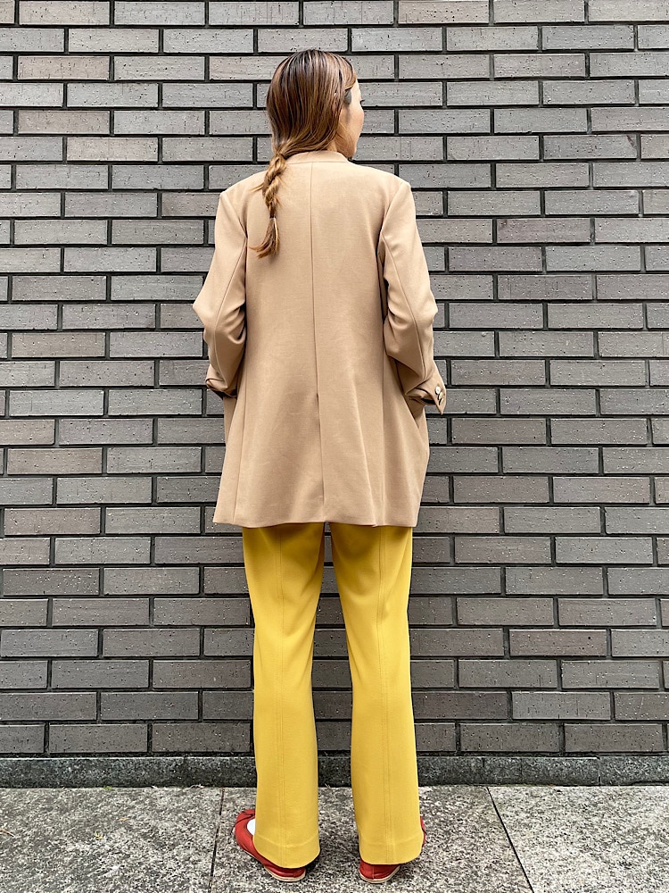 素材感・着心地:ウール素材ですが比較的薄手です。裏地が付いている為、着脱もスムーズです。センターにステッチが入っている為、スッキリとしたシルエットです