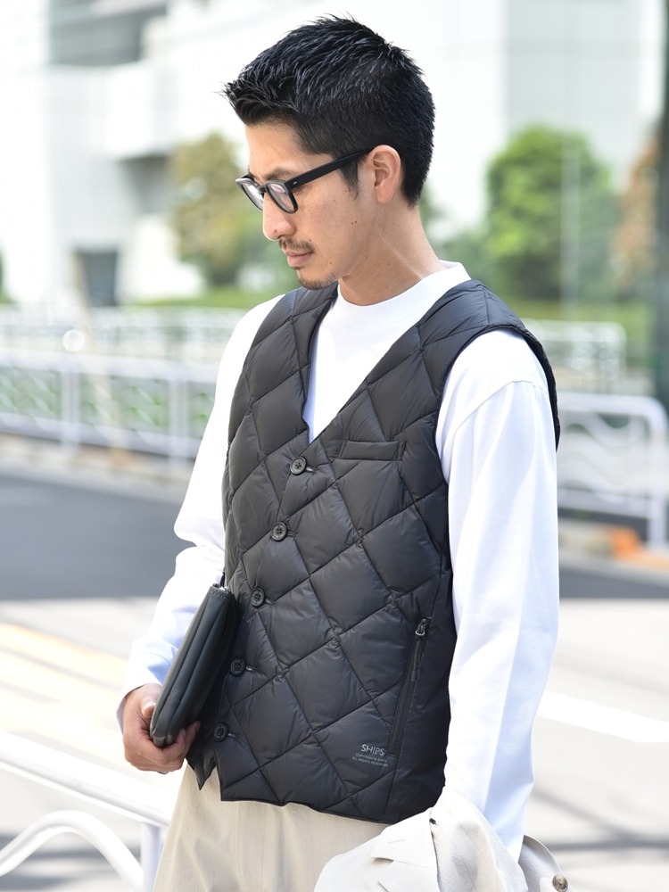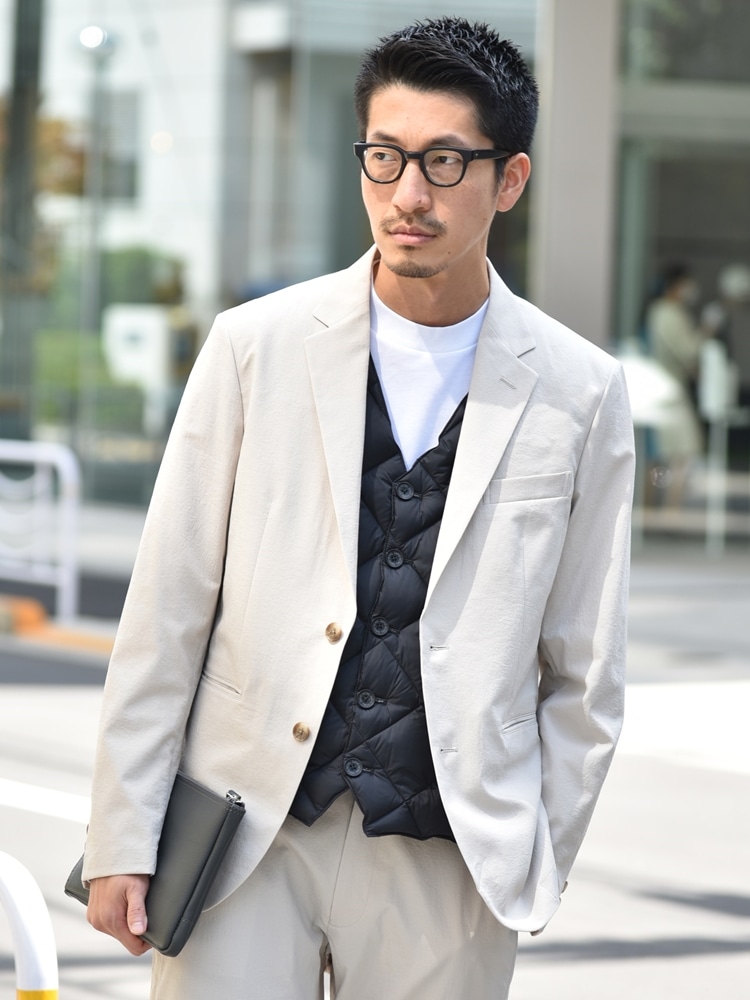 ビジネスカジュアルにもマッチする、ジレ型インナーダウンを使用したスタイル。