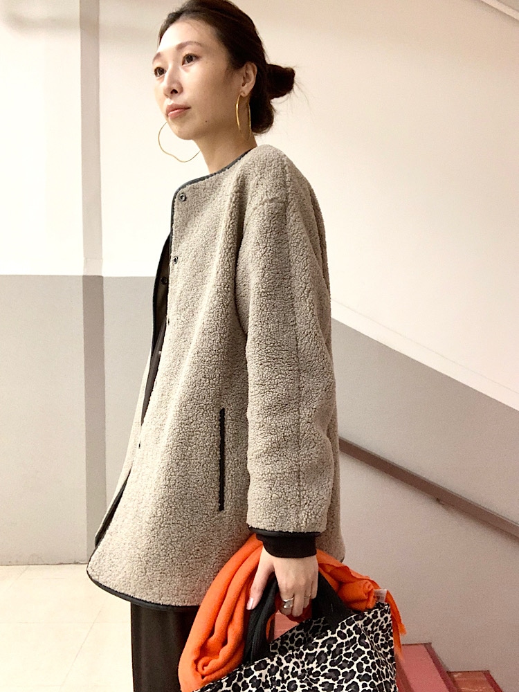 素材感・着心地:軽い素材で気軽に羽織れる。色味も落ち着いた色なので大人な印象で着て頂けます。