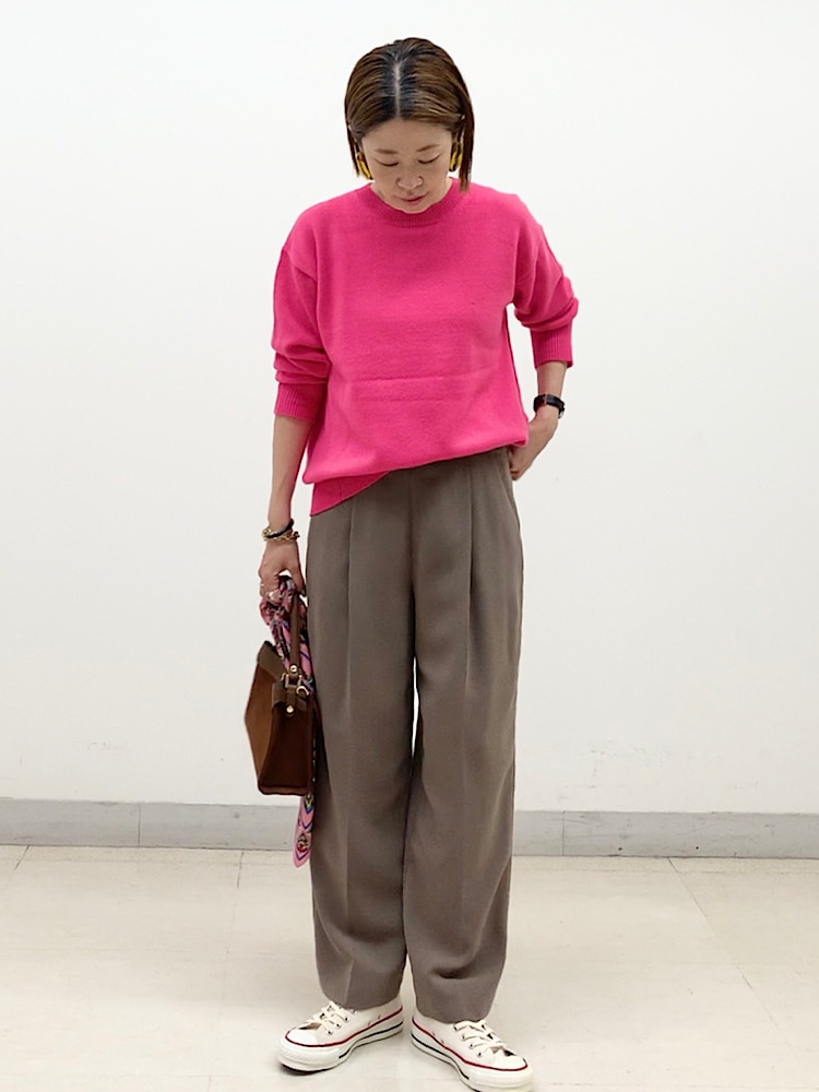 シンプルなコーディネートは、色と素材のミックスで遊ぶのがポイント。