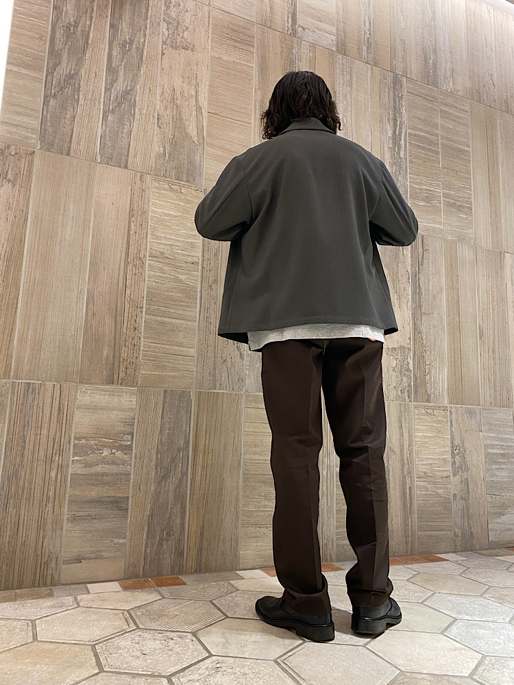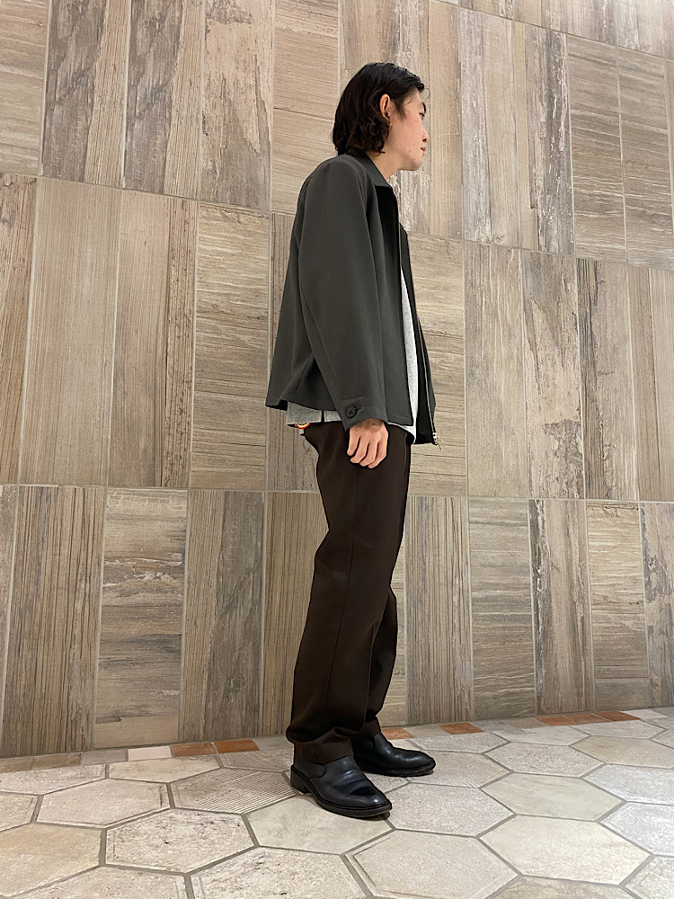 【素材感・着心地】素材はポリエステルですが。ウールのような見た目が特徴です。身幅がゆったりとしていて、着丈が短いシルエットをしています。綺麗目からカジュアルスタイルまで、幅広いコーディネートに合わせられると思います。