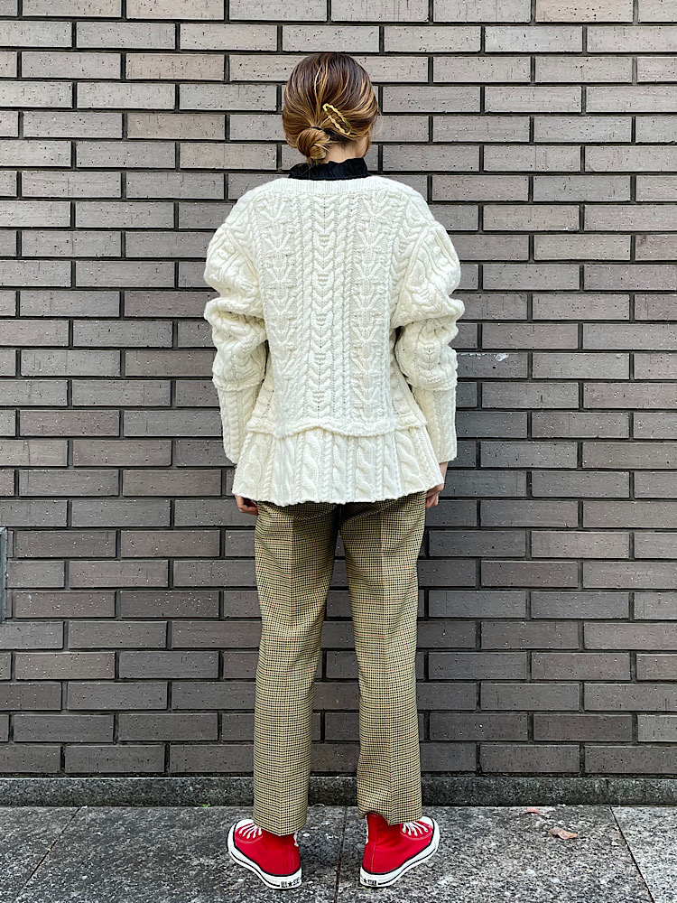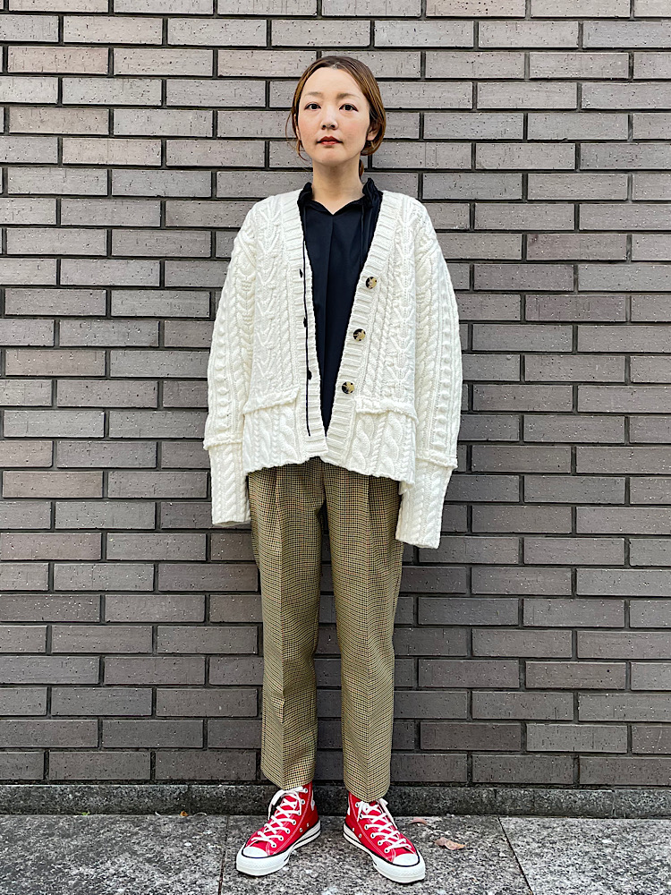 素材感・着心地:柔らかいウール素材。肩回りはゆったりしており袖幅も太いのでインナーを選ばず着用できます。長めの袖もポイントです