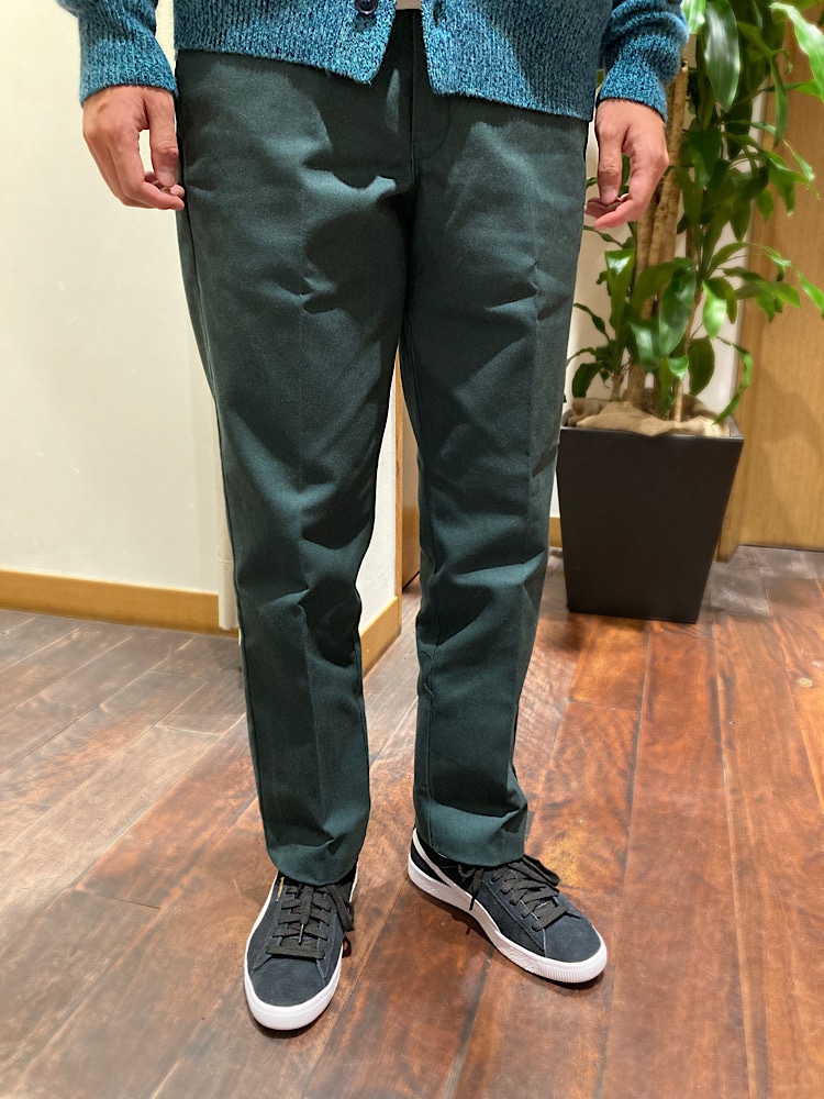 ワークパンツらしいゆとりがありつつテーパードが効いている。