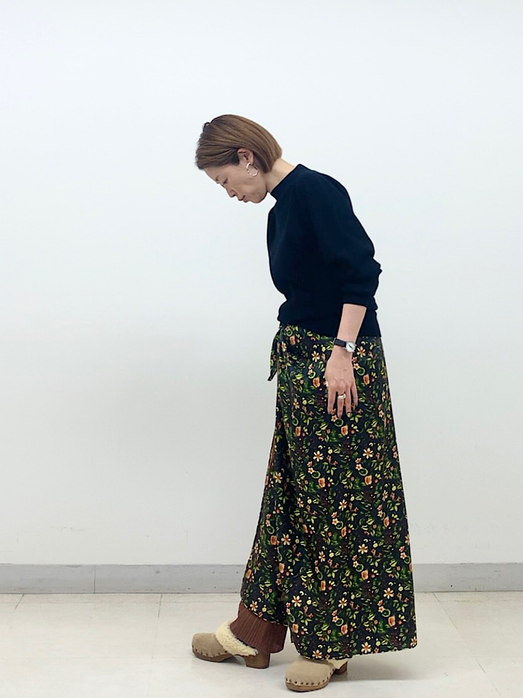 ちらっと見えるニットレギンスをヘルシーに綺麗目にスタイリング。足元はボアのサボでトレンド感と季節感を。