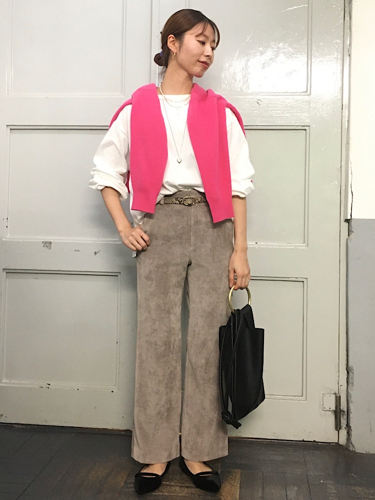 サイズ感:ウエストはトップスインしやすい余裕あり。着丈は長すぎないのでフラットシューズでも合わせて頂けます。
