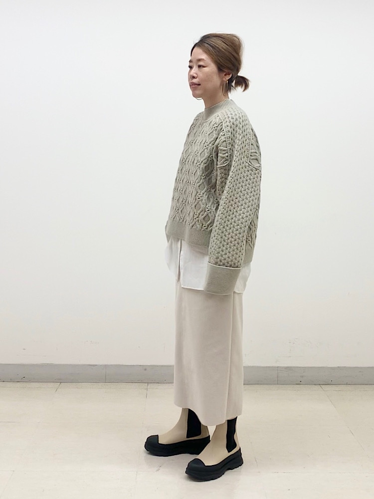 ベージュ〜オフホワイトのワントーン。ケーブルニットでも幼く見えないスタイリング。