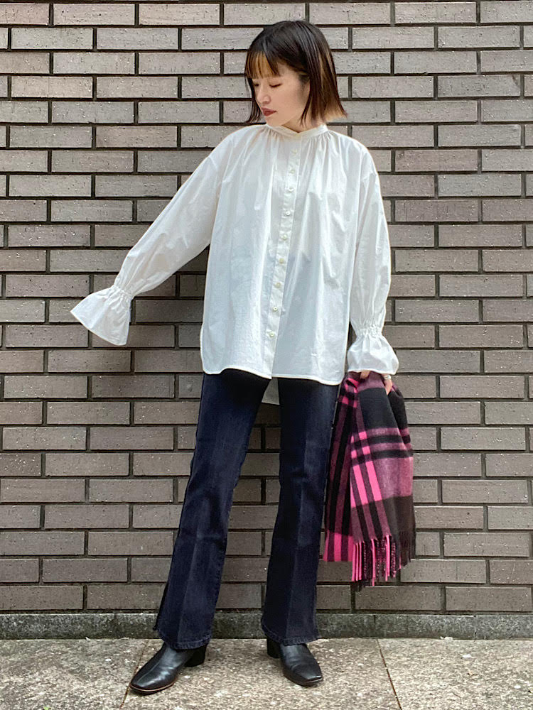 シンプルなシャツブラウスも、キャンディスリーブなので