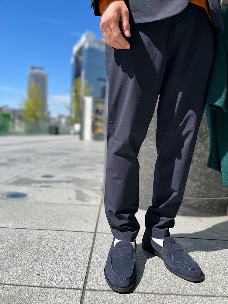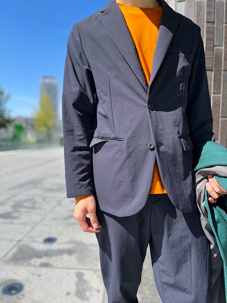 着用サイズ: ジャストサイズです。ジャケットと同素材で、ストレッチがかなり効いており、着ていてストレスになりにくいです!