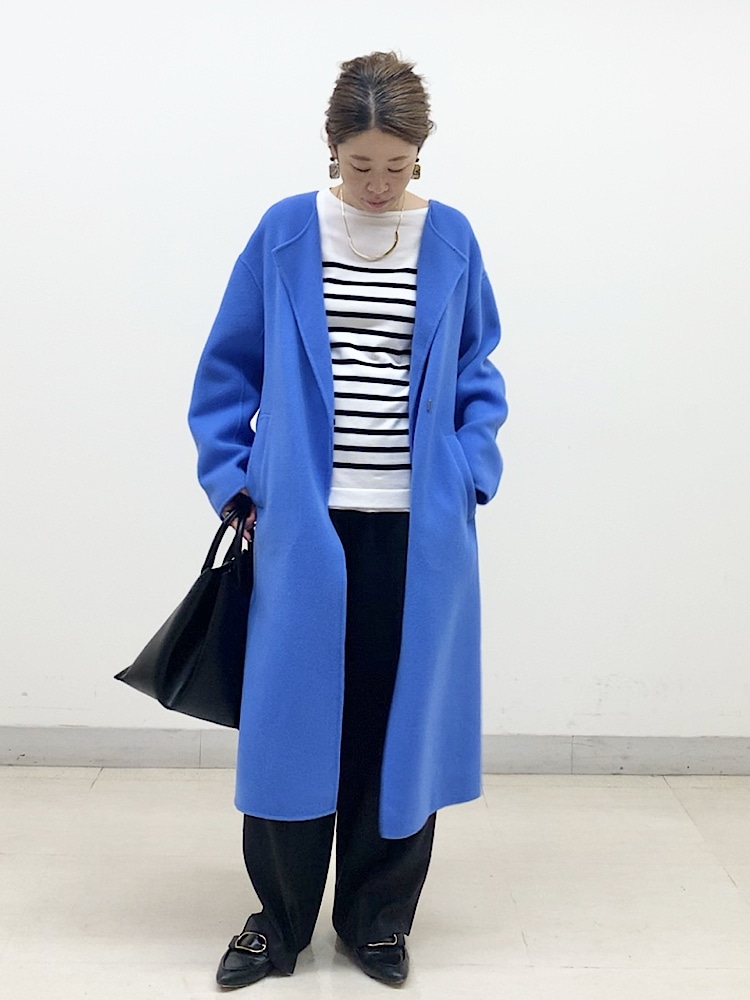 カラーコートを主役に。定番アイテムの組み合わせも、サイズ選びでこなれた印象になります。