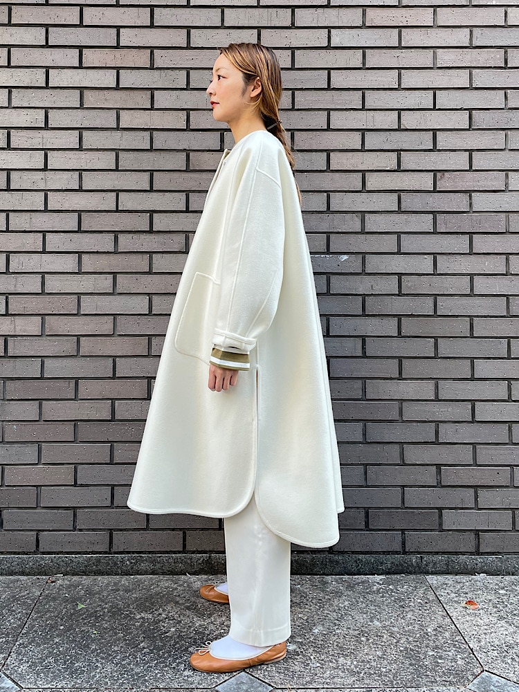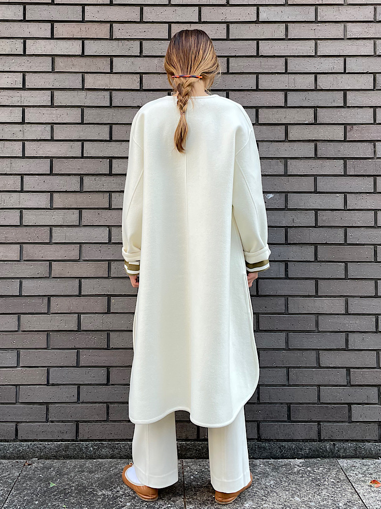 素材感・着心地:ウール素材ですが比較的薄手です。白ですが裏地も付いており透け感等は気になりません。センターにステッチが入っている為、スッキリ見えるシルエットです