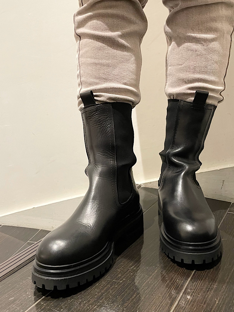 商品紹介:生地が柔らかく足にフィットするのでサイドゴアでも歩きやすいと思いました。またソールの部分のボリューム感が程よく、履かれている感が出ずすっきりしたシルエットでした。