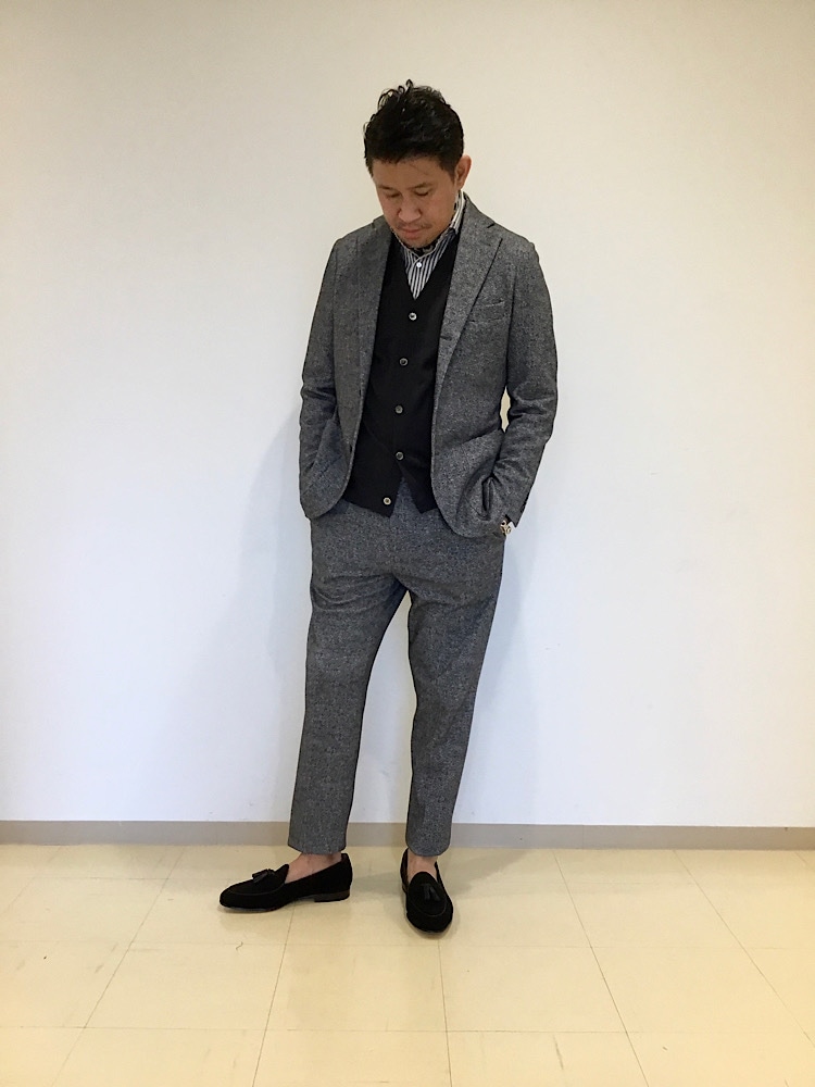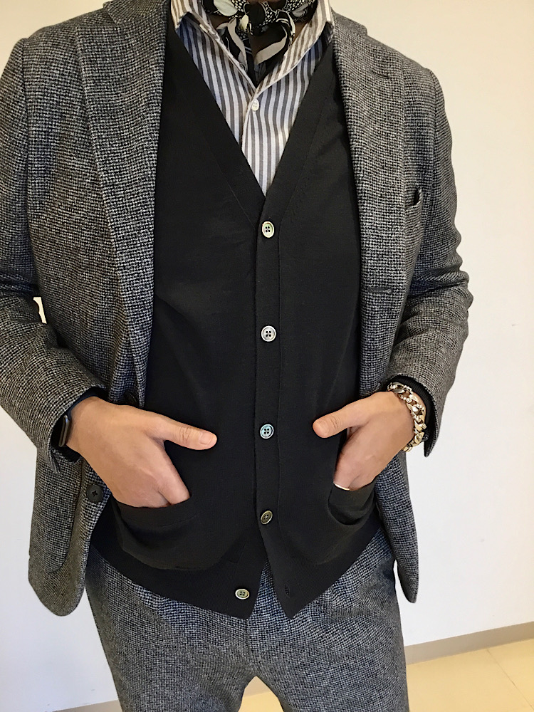 セットアップ・スーツにカーディガンを差し入れポイントにしました。アクセントに首にプリントスカーフを巻いています。