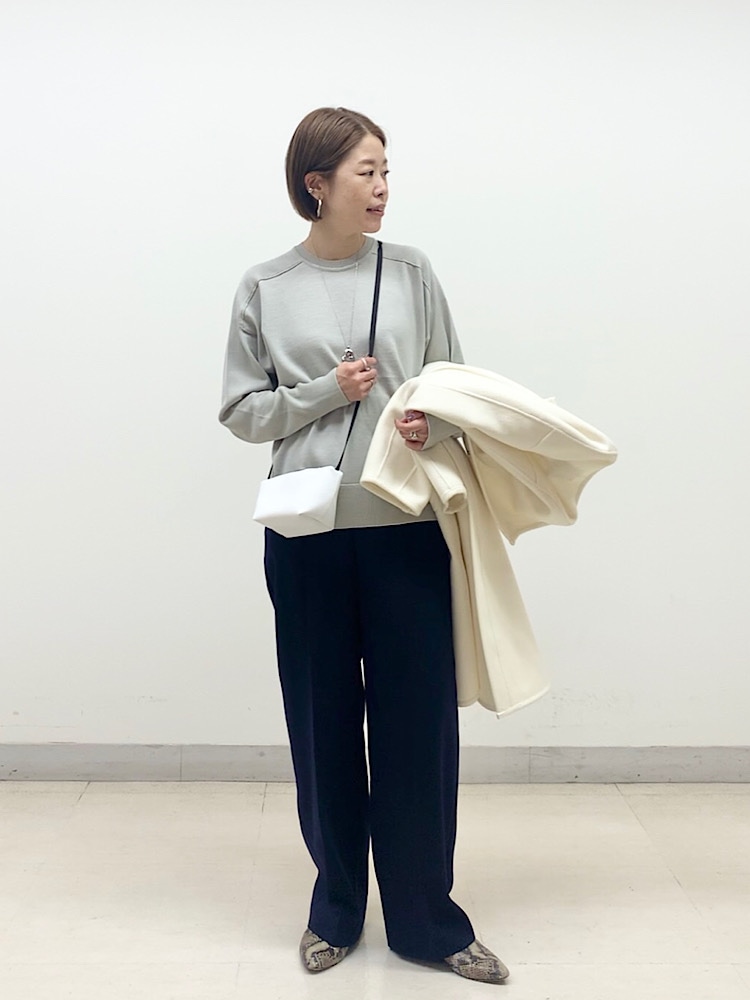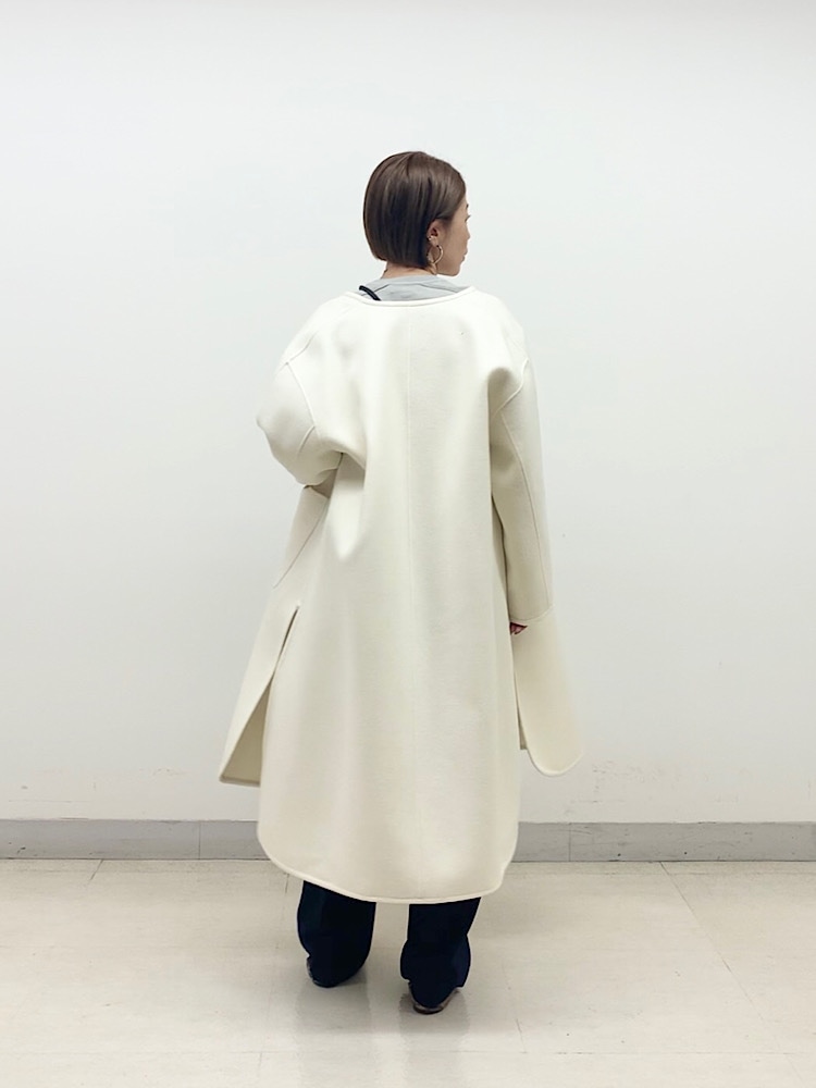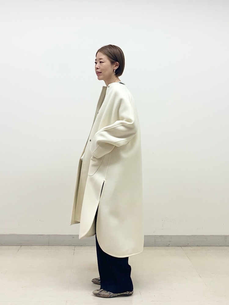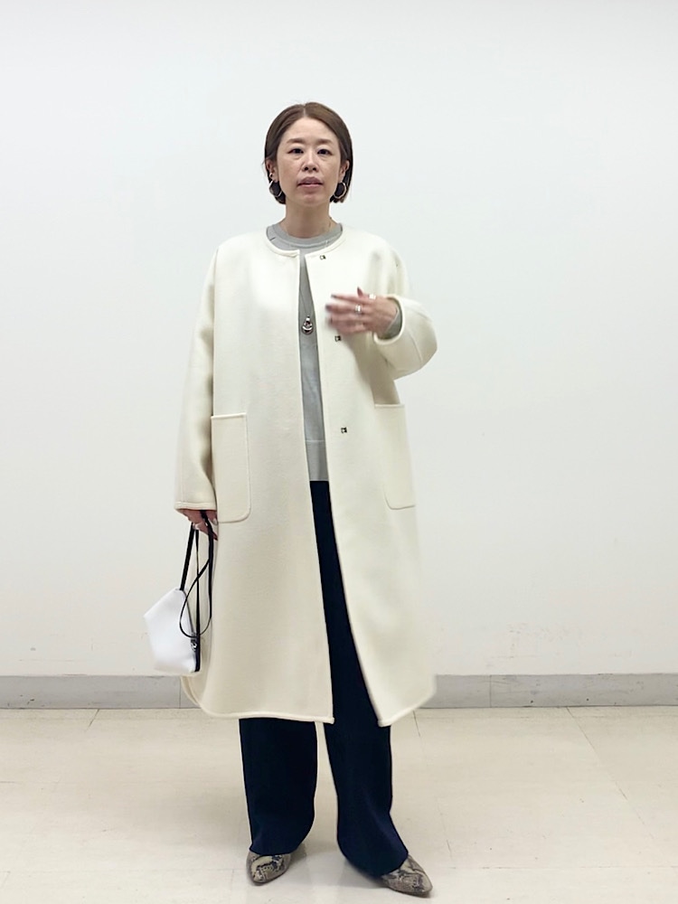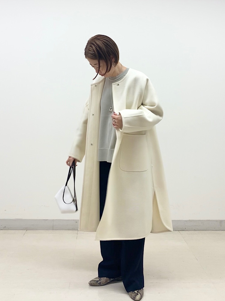フェミニンな白のノーカラーコートをシャープに。ゆるめのパンツを合わせてメンズライクなテイストをミックスして、バランスを取っています。