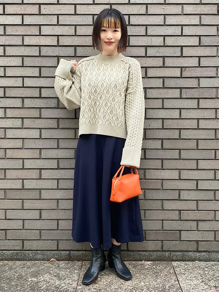 女性らしいコーディネート。オレンジのバッグが差し色です😊
