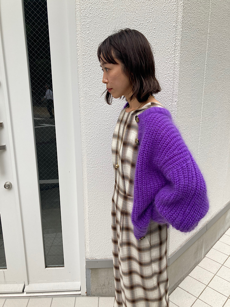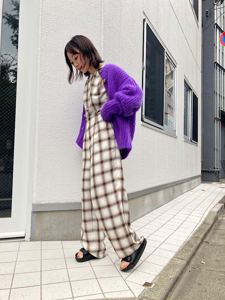 オンブレチェックのサロペットに鮮やかなパープルのカーディガンを合わせたのがポイントの秋コーデです。 サロペットは前後で使える2way仕様で中にカットソーなどで合わせても素敵です。 人気のブランドUHR(ウーア)の新作のカーディガンは毛足が長いニットでコートを着ているような暖かさです。 ざっくりとしてルーズな形も抜け感があって着ていただくととても可愛いです! 身長:153cm