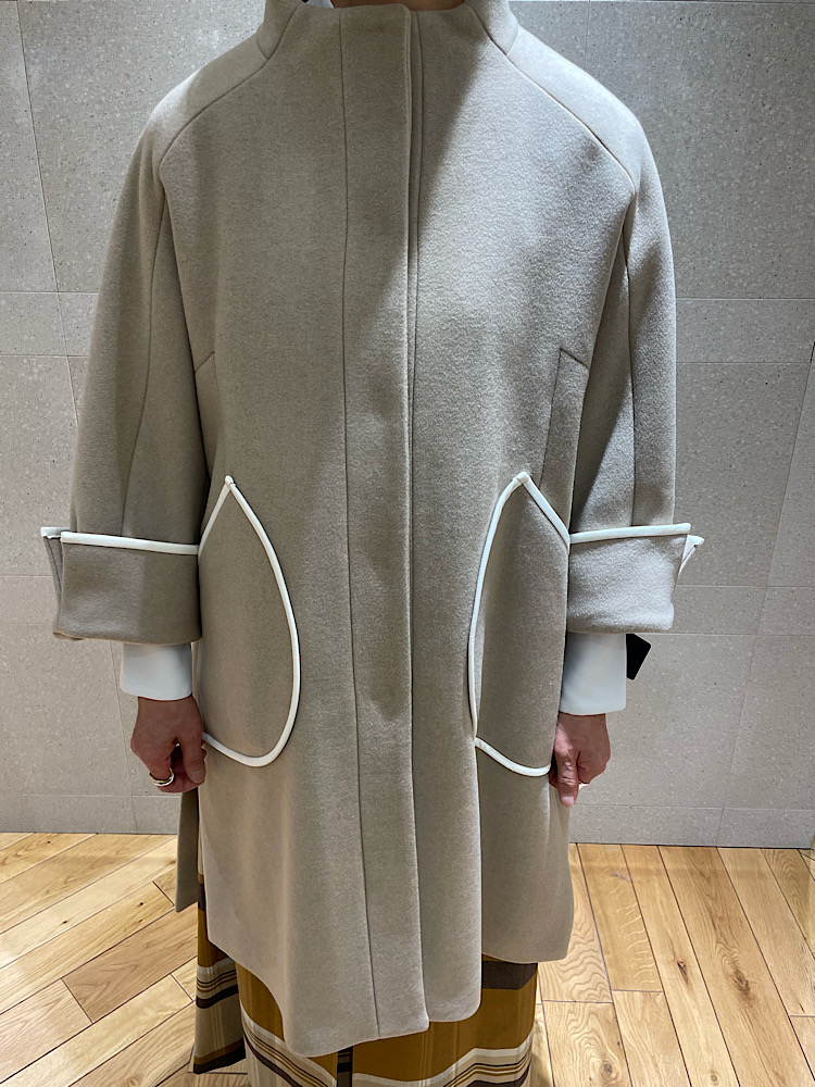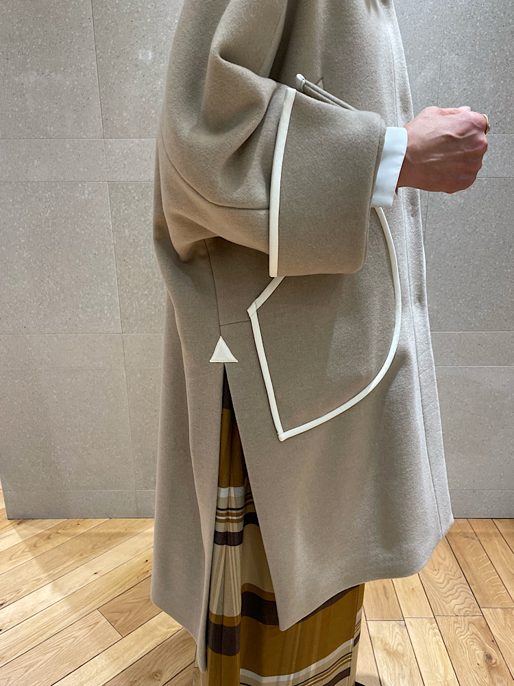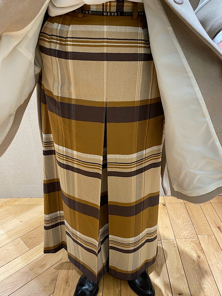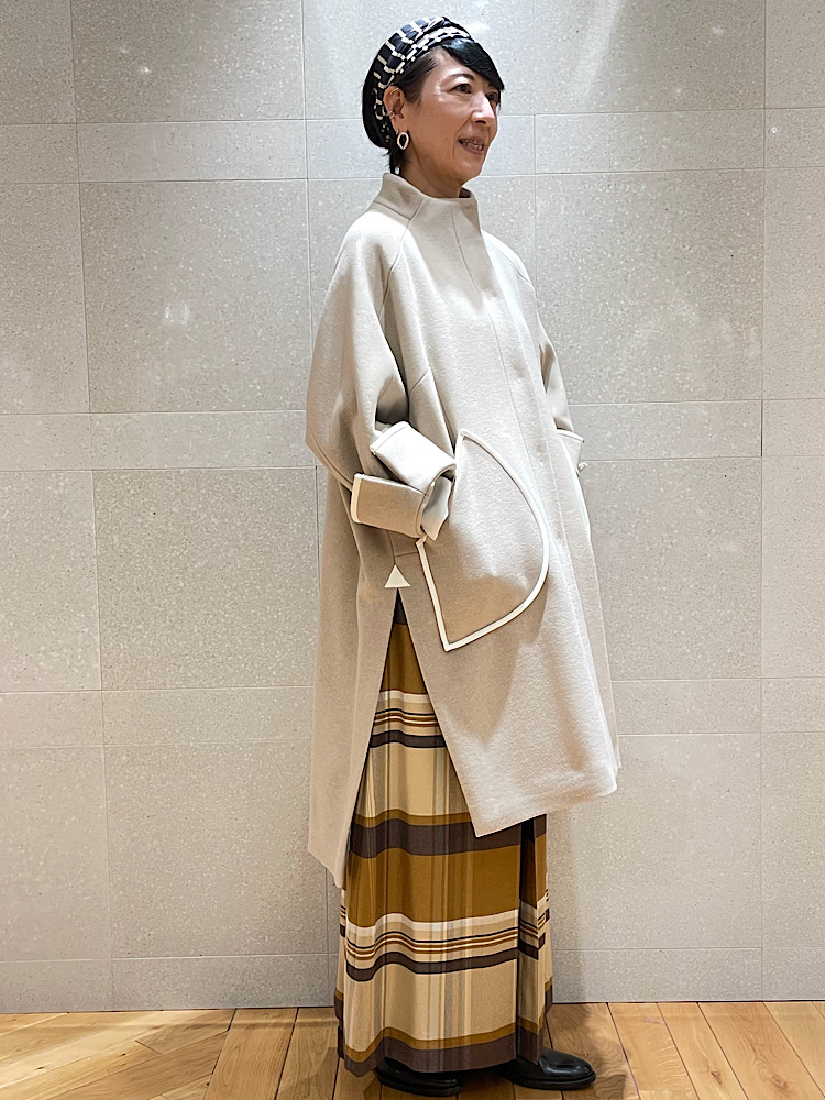 【素材感・着心地】アウターは73%ウール&27%ナイロン。袖口の折り返しとパイピングや襟のデザインがクラシックな雰囲気を。キュロットはベージュ&ブラウンの暖色系チェック。程良い重みにより広がりを抑えた落ち感が素晴らしい。暖かみある同系色カラーでのスタイリング。