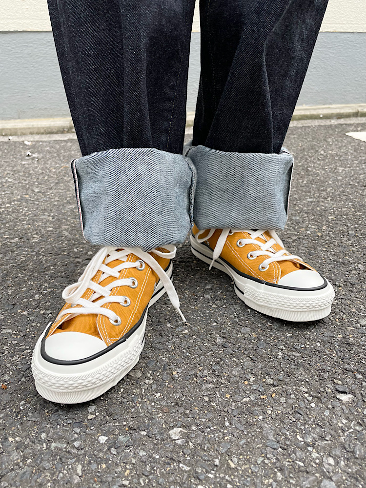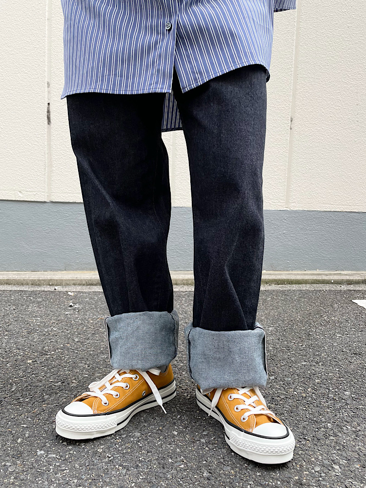 商品紹介:元々サイズ感が大きめなのですが、シルエットがワイドすぎないので裾をおって着てもすっきり履くことができました。ベルトループが着いているので多少ウエストが大きくてもベルトで調節していただけます。