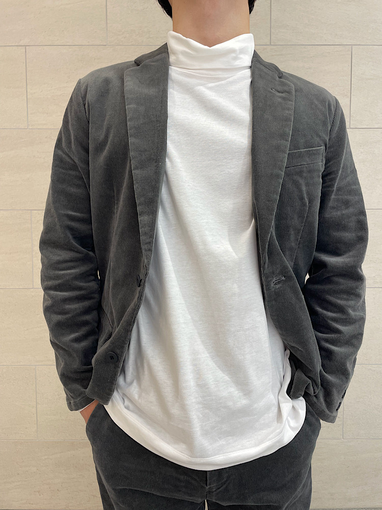 【素材感・着心地】コーデュロイで出来ており、季節感あふれる商品。他のセットアップに比べて、綺麗なシルエットでお仕事でも使いやすい。