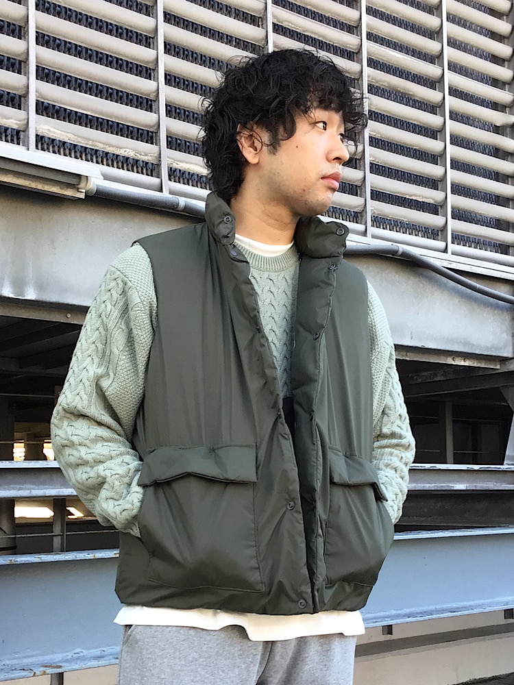 昨年好評だったTAIONのダウンベストが登場しました。リラックス感のある雰囲気でさりげなくモックネックをインナーに合わせてます!