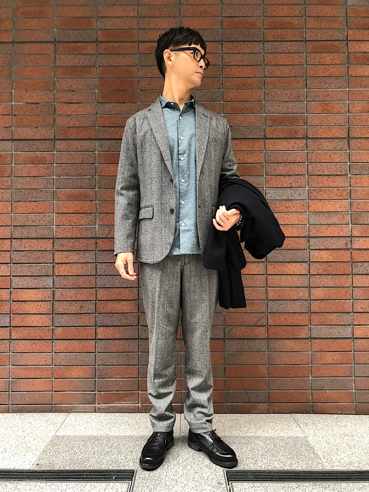 セットアップにベーシックなアウター合わせでありながらリラックスした雰囲気で。
