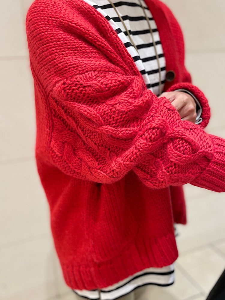 写真着用のニットカーディガンは発色のよい赤が目を引く一点です。