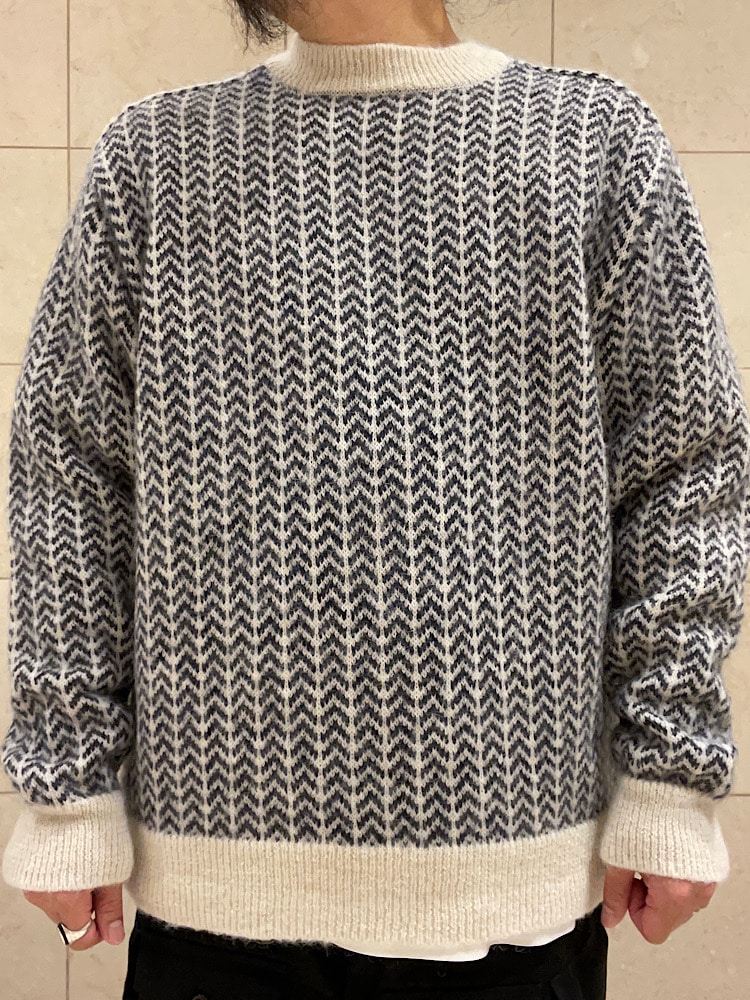 素材感・着心地:毛足の長いモヘア独特の軽く、暖かく、豊かな風合いが特徴です程良い肉厚感で、軽い着用感がポイントです。身幅、アームホールはゆったりとしていますが着丈は短めです。