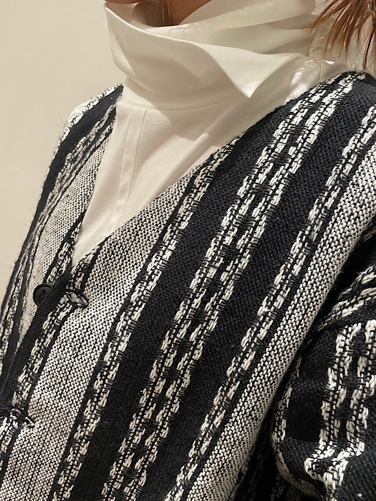 【素材感・着心地】ノーカラーなのでさっと羽織りやすく、緩いのでレイヤードも楽しめます。
