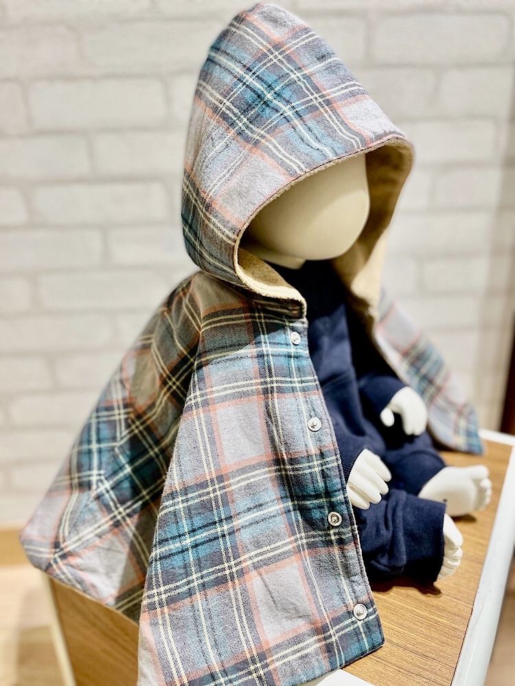 綿100%ネルチェックとなめらかな肌触りのフリース とのリバーシブルマントです。