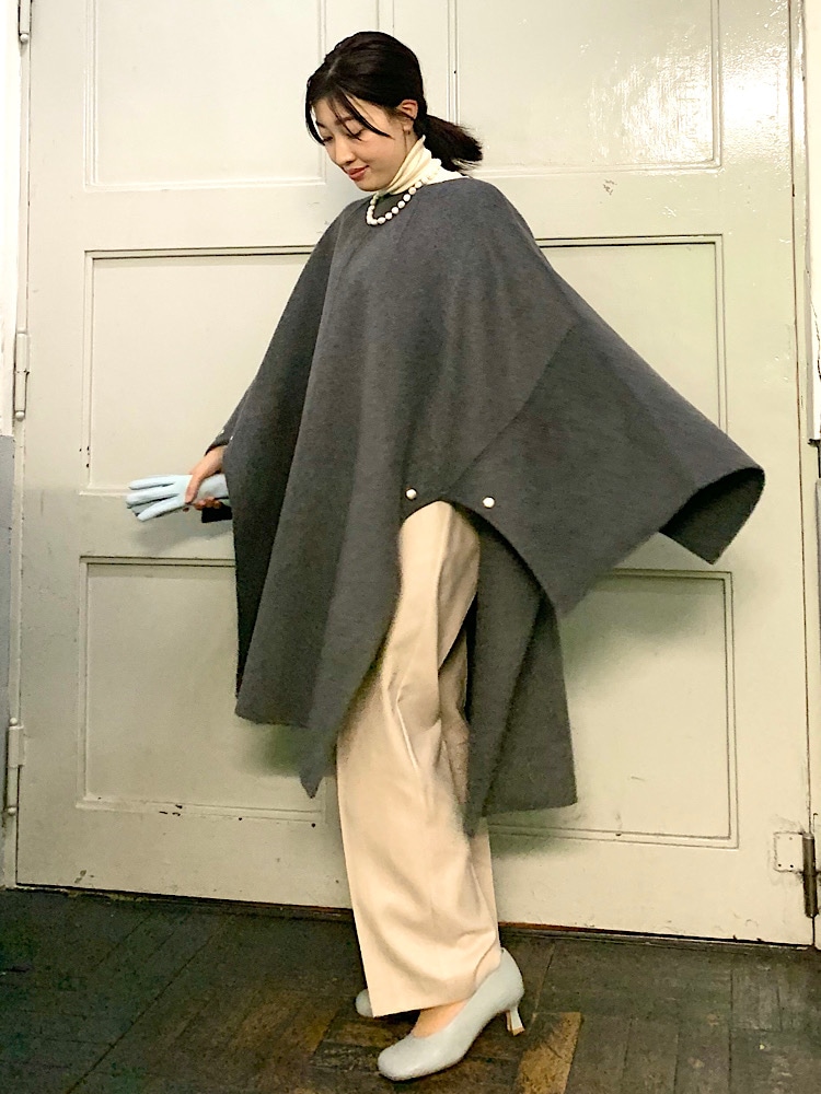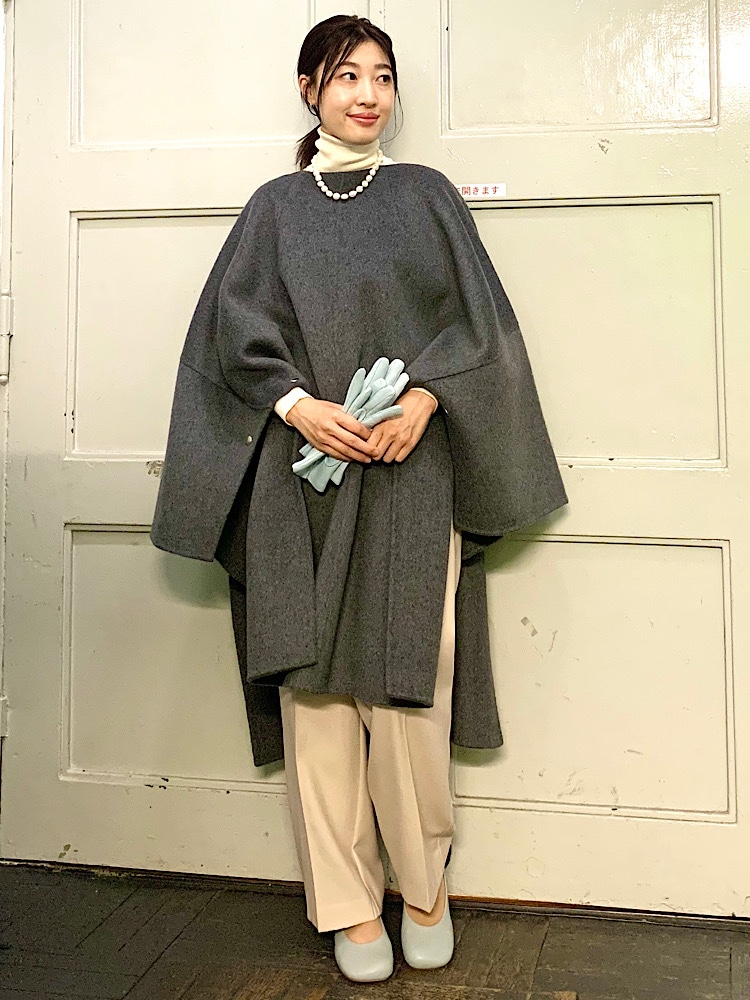 素材感・着心地:滑らかなウール地です。重さのある素材感でアウター感覚で着こなし楽しめそうです。