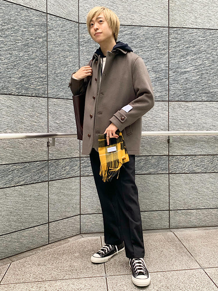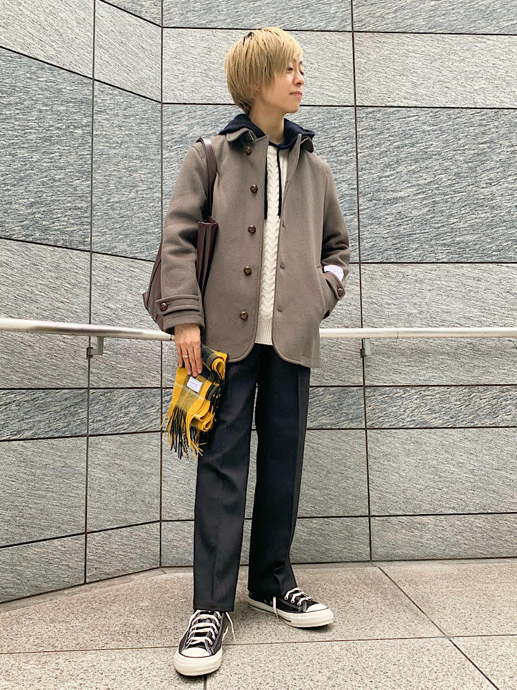 新作のメルトンコートに映えるイエローのマフラーで。