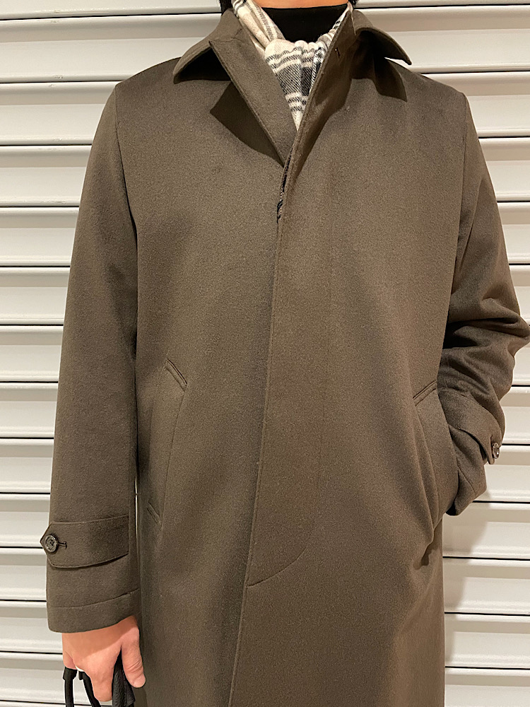 【素材感・着心地】これからの季節にぴったりな起毛感のある素材感です。肩腕周りに余裕がありおもくありません。スーツやジャケットの上からでもストレスが少ないです。