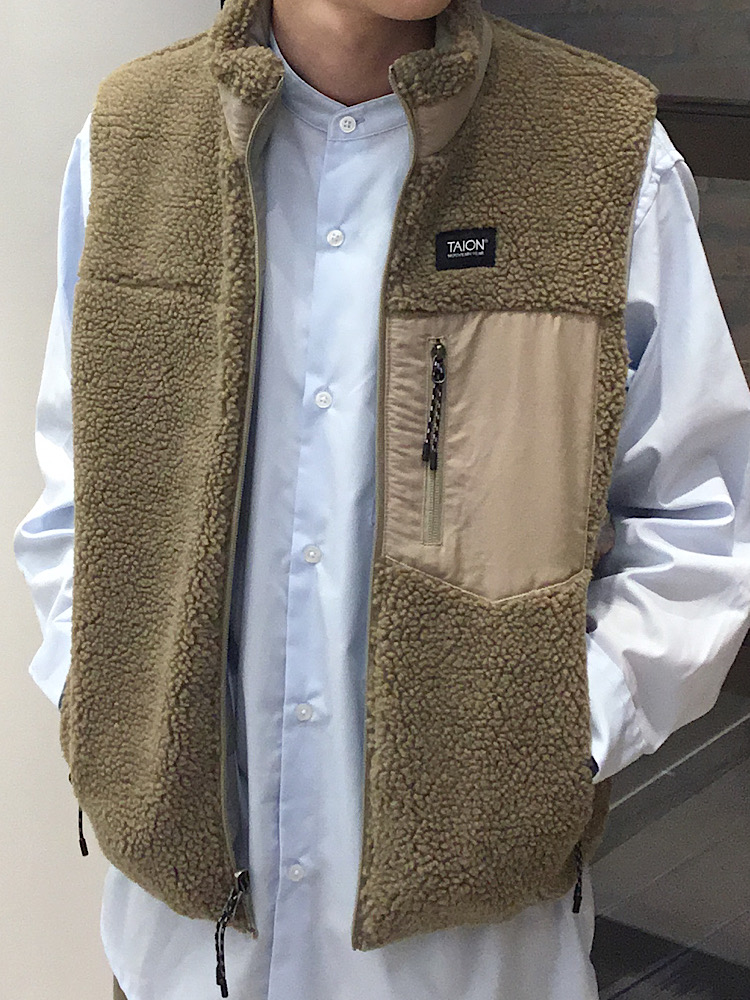 マウンテンパーカーをカジュアルにゆったり目なパンツに合わせ、カジュアルになり過ぎないようにライトブルーの綺麗目シャツを差し色に使ったコーディネートです。取り外し出来るフリースベストも使い勝手◎