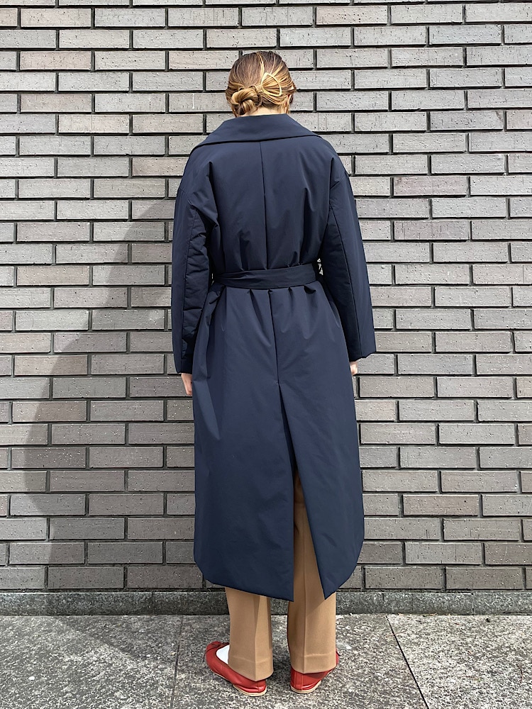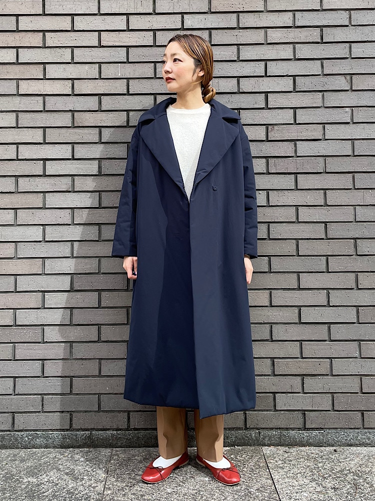 素材感・着心地:ポリエステルでマットな素材感です。中綿で軽く、スッキリと着用できるシルエットです