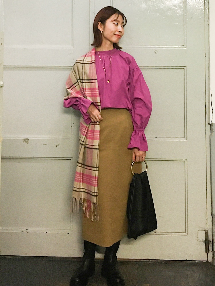ピンク×キャメルの甘めコーデは
