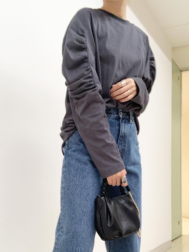 着心地:ハイウエストで腰回りがしっかりホールドされ安心感のある履き心地。ぴったり過ぎない程よいゆとりのあるサイズ。シーズン問わず履きやすい色味です。