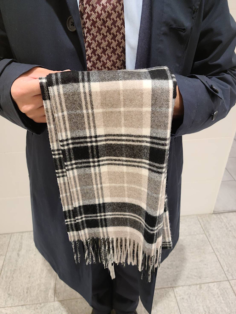 【素材感・着心地】カシミア100%でトロンとした滑らかさです。今年はふわっと巻いたり、首元に軽く掛ける程度が活きです。