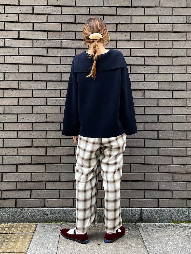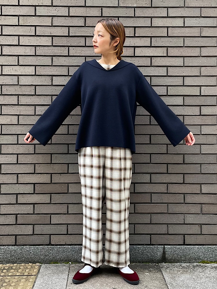 素材感・着心地:毛足の短いウール素材です。厚みはなくカットソーの様な感覚で着用できます。セーラーカラーがポイントです