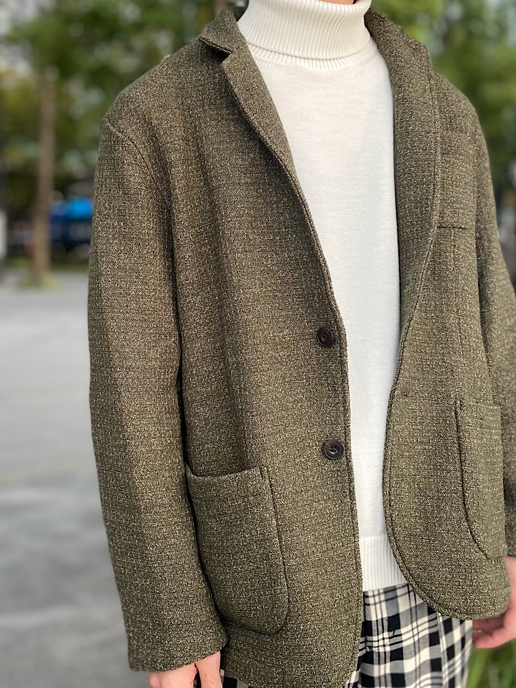 サイズ感:やや大きめにスタイリングしました。伸縮性がありつつも、しっかりとした素材感です。