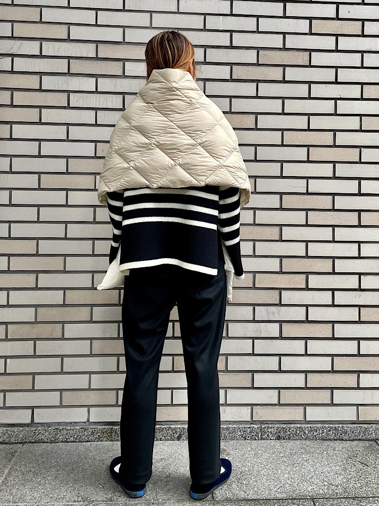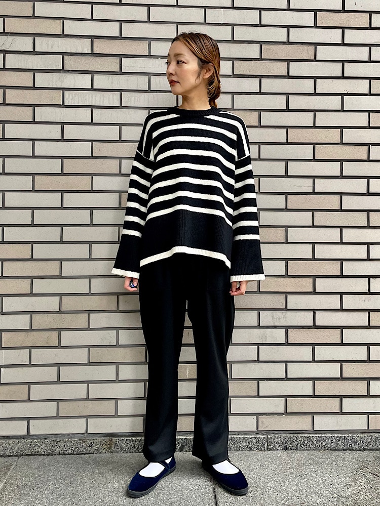 素材感・着心地:ウール/アクリルの柔らかく軽い素材感。袖は少し広がっておりサイドにスリットも入っています。肩周りもゆったりしている為、中にシャツ等を重ねても可愛いです