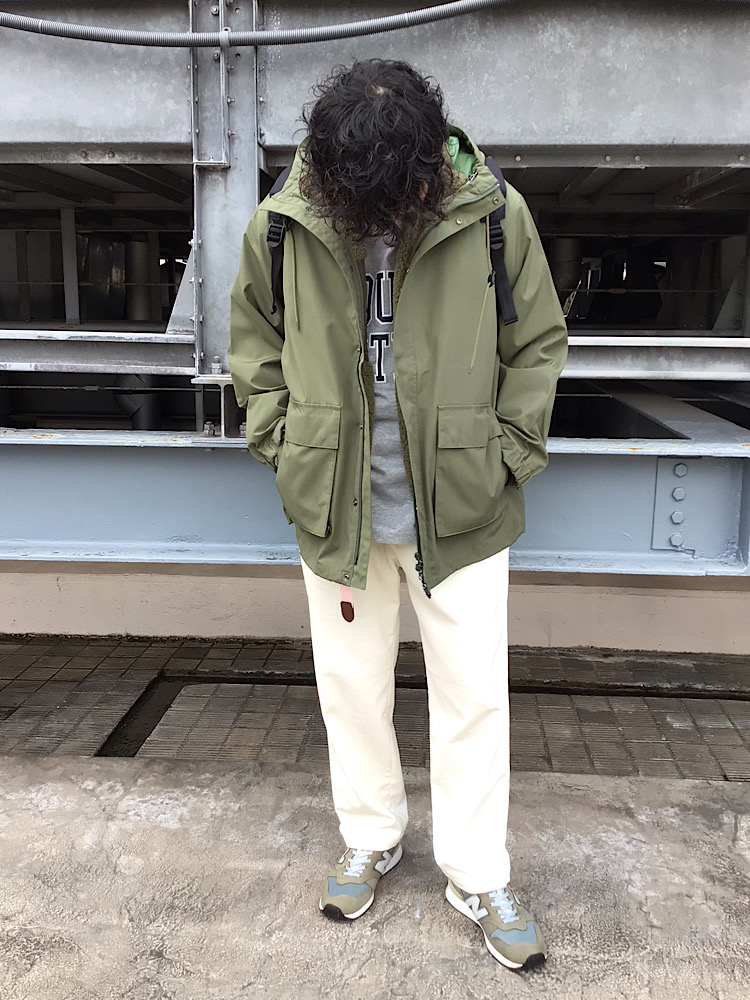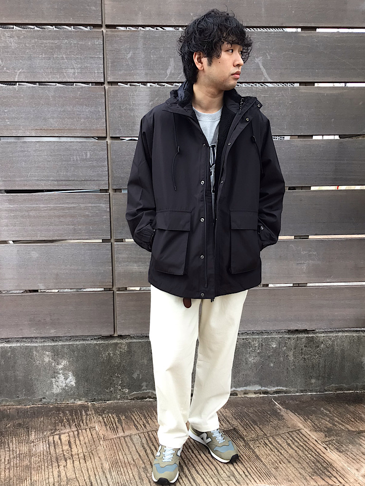TAIONのマウンテンパーカーを羽織り、これからの寒い時期に活躍すること間違いなしのコーデュロイパンツはホワイトカラーをチョイスして爽やかな印象に。