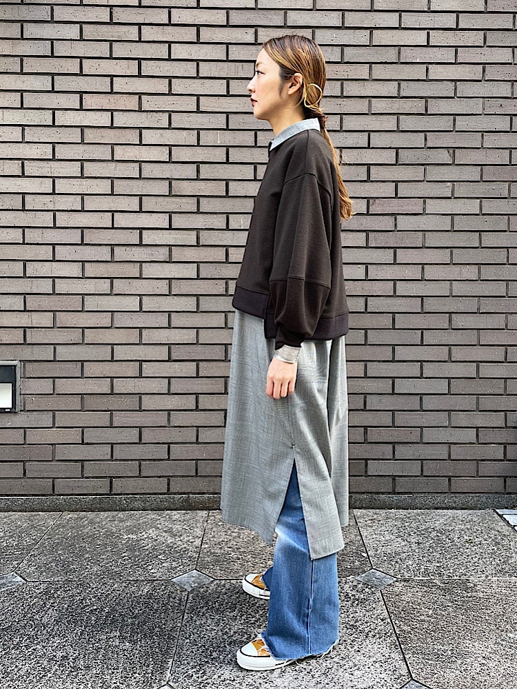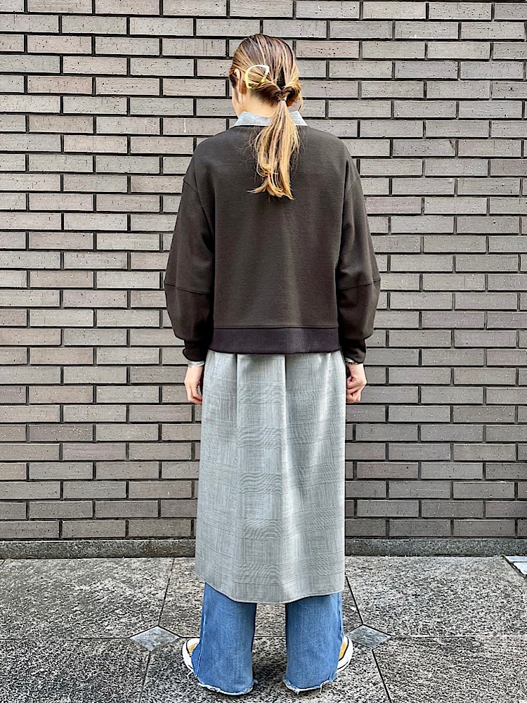 素材感・着心地:アクリル/ウールのややハリ感のある素材。スウェットの様な厚みと着心地です。コンパクトなサイズ感なので、ワンピースやボリュームのあるボトムとの相性が抜群です