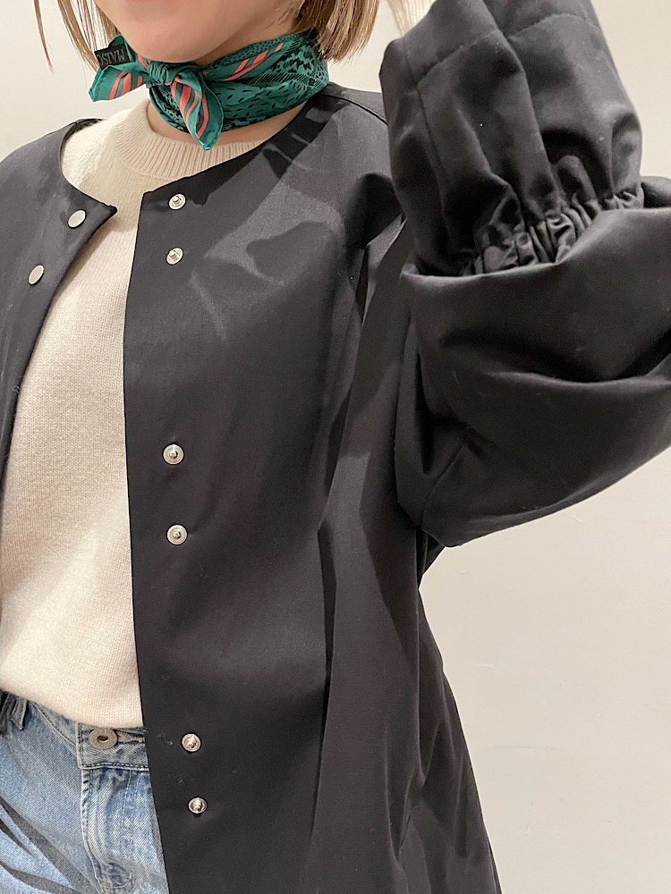 商品紹介:袖のデザインがワンポイントのアウターです。袖口がゴムなのでしっかり腕にとまり、体温調節もしやすいです。ノーカラーなのでインナーにスタンドカラーのものや、フードがあるトップスを中にきてもバランスよく着ていただけます。素材的にも春でも着ていただけます。