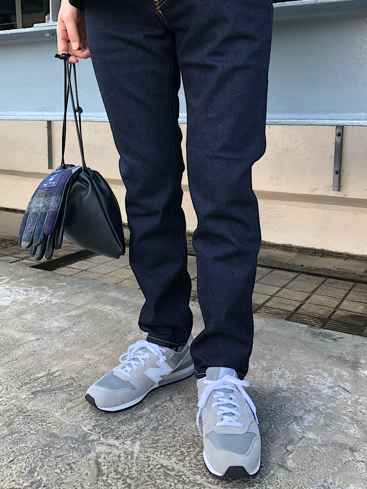 素材感: 生デニムのような見た目ですが、ストレッチが効いています。レングスも日本人の体型に合わせているので、どなたでも履きやすいと思います!