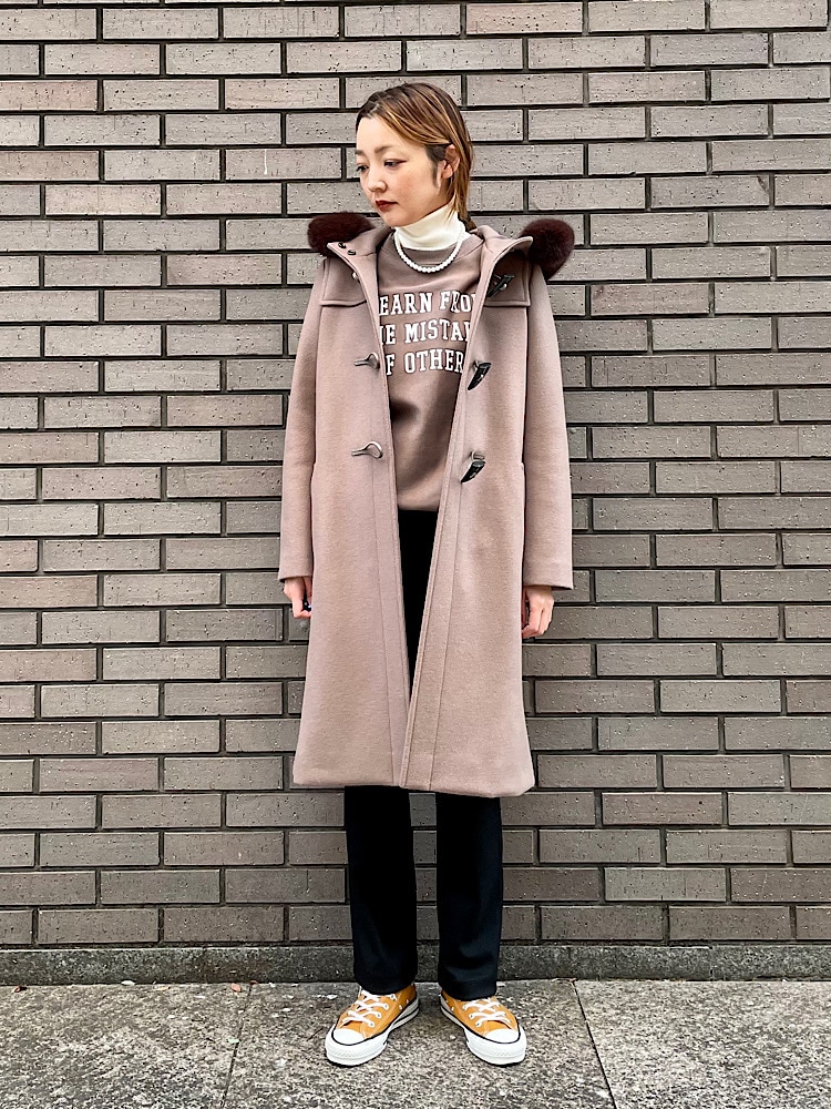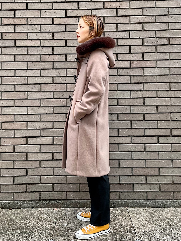 素材感・着心地:ウール/ナイロンの少しハリのある素材感。肩周りがスッキリしており、着丈も長すぎないのでパンツとの相性が抜群です。着脱可能なファーもボリューム感が可愛いです