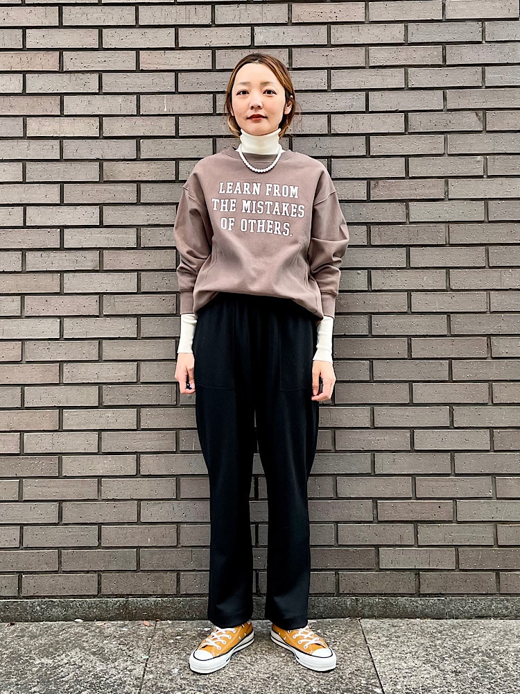 素材感・着心地:コットン素材でスウェットとしては比較的薄手です。詰まりすぎていない首元からは、襟やインナーを見せても可愛いです