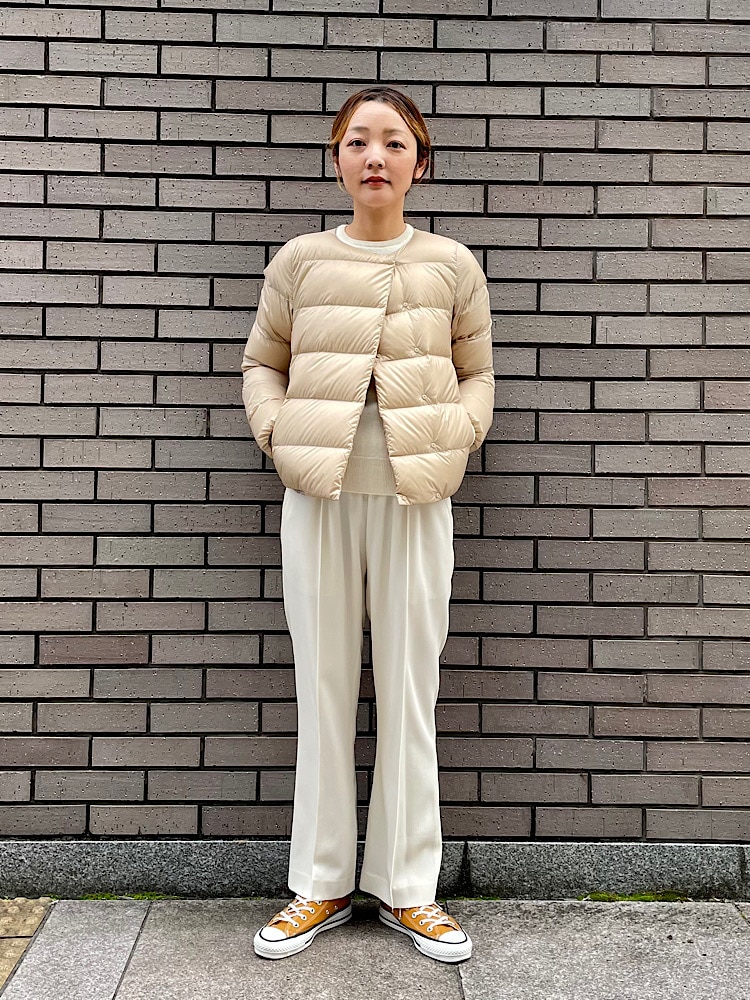 素材感・着心地:やや光沢のあるナイロン素材。ダウンですが、ボリュームが出すぎずスッキリ着用できます。インナーダウンとして着用する場合はジャストサイズ、アウターとして着用する場合はワンサイズアップすると、ゆとりがでます